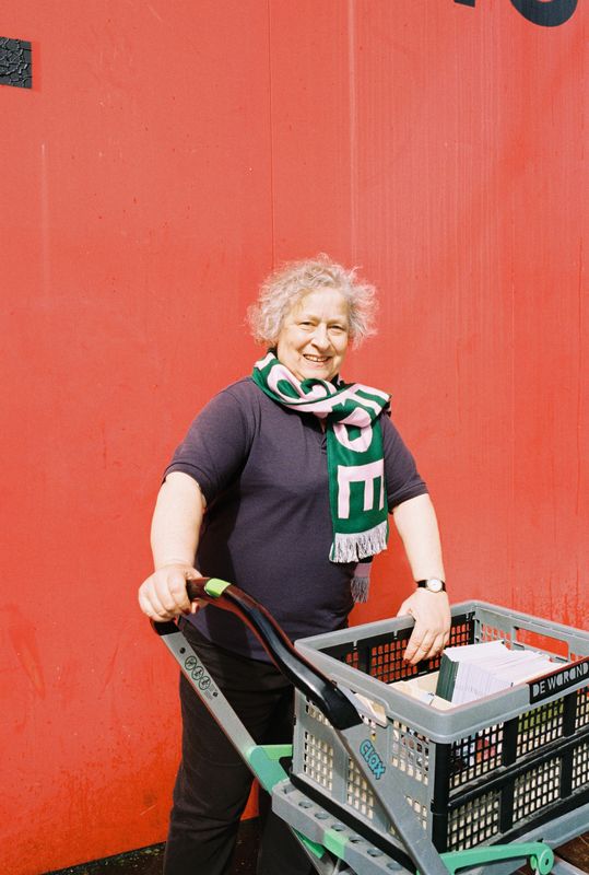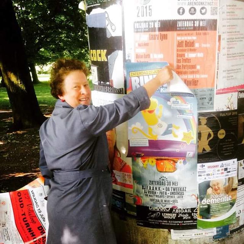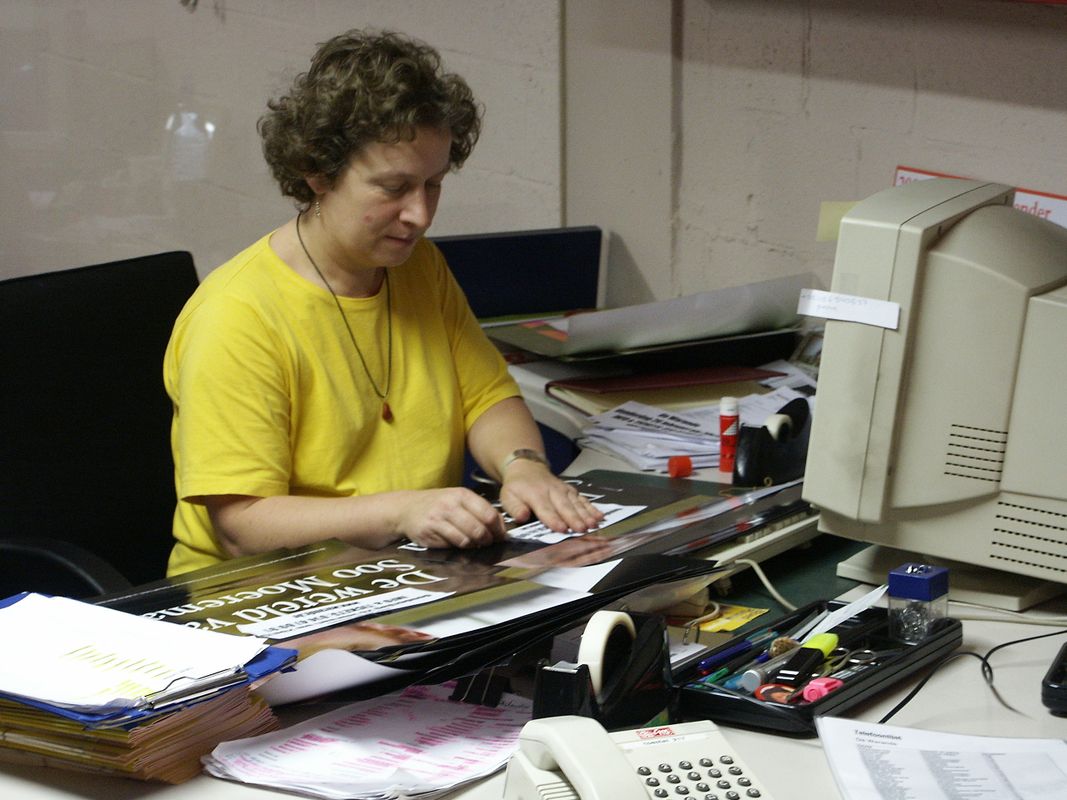 Twee jaar later komt Christine in vaste dienst. Na een zwaar arbeidsongeval en een lange herstelperiode pikt ze in 1987 de draad weer op, voortaan als polyvalent medewerker. “Opeens had de Warande computers; de allereerste, van die grote bakken”, herinnert ze zich. “Dagelijks sorteerde en verdeelde ik de post voor de Warande en de bibliotheek, vaak een jute zak vol. Samen met collega’s ging ik bij bezoekers thuis interviews afnemen. Met onder andere Marrek Leysen, de drukker die ook de handgeschilderde reclameborden voor de Warande maakte, reed ik Turnhout rond om affiches te plakken op de toen nog talrijke palen. Zelfs verkiezingsaffiches liet de Stad Turnhout ons verspreiden.”