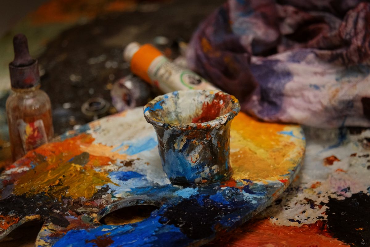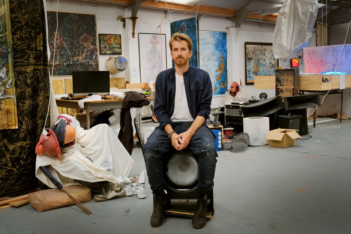 Het atelier van Joris Van de Moortel is een grote hangar op de rand van de Hobokense polder. De maquette van de houten “floup gloup sloep” die hij in 2021 in Kortrijk voor de Triënnale bouwde, valt meteen op. Enkele metalen karren - “alchemistische keukenmodules” - hangen vol met allerlei voorwerpen die tot leven komen tijdens performances van de kunstenaar. Op metershoge schilderijen tegen de muren slaan doodsbange skeletten op de vlucht voor uitbarstende vlammen. Tafels en kasten zijn bezaaid met boeken, obscure strips en vooral heel veel teken- en schildermateriaal.
