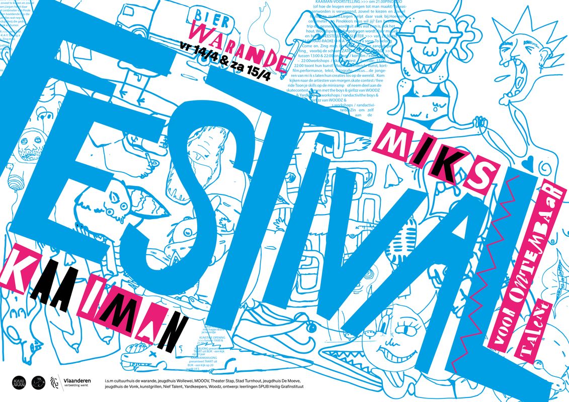 het m i k s & KAAIMAN festival is een samenwerking van Jeugdhuis Wollewei, Theater Stap, MOOOV en de Warande met de steun van de Stad Turnhout en de Vlaamse Overheid.