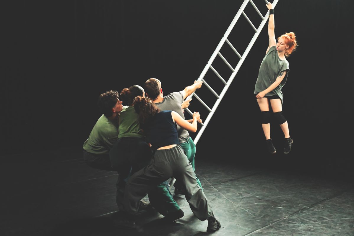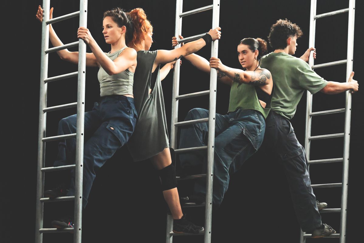 Met ladders, variërend in grootte en hoogte, bouwen de spelers indrukwekkende constructies, zoals boogsculpturen en draaiende kranen. Ze balanceren de ladders tot een spannend, wankelend speelveld. Ze verkennen onbekende hoogtes, klimmen, zweven en wagen zich aan een gedurfde choreografie. Elke centimeter en elke seconde is van belang. Ze zoeken de uitersten op en ontdekken hoe ver ze elkaar kunnen drijven. Fysieke afhankelijkheid was nog nooit zo spannend.
